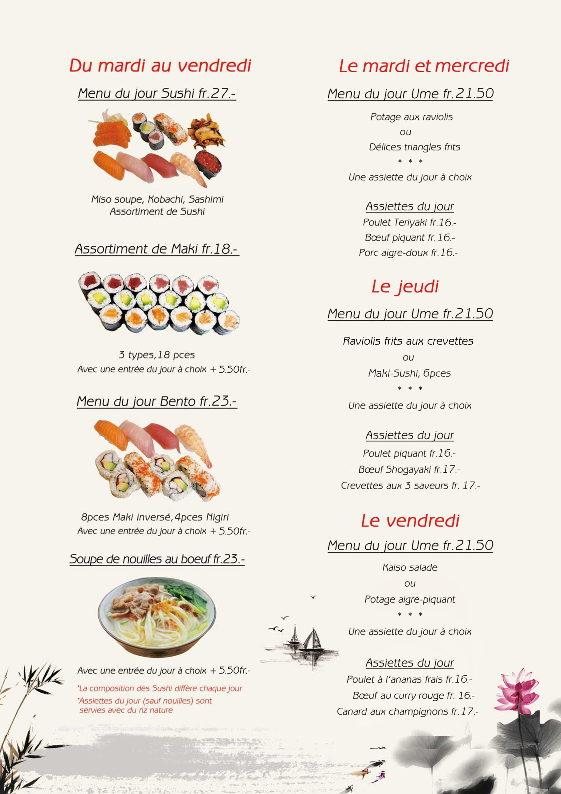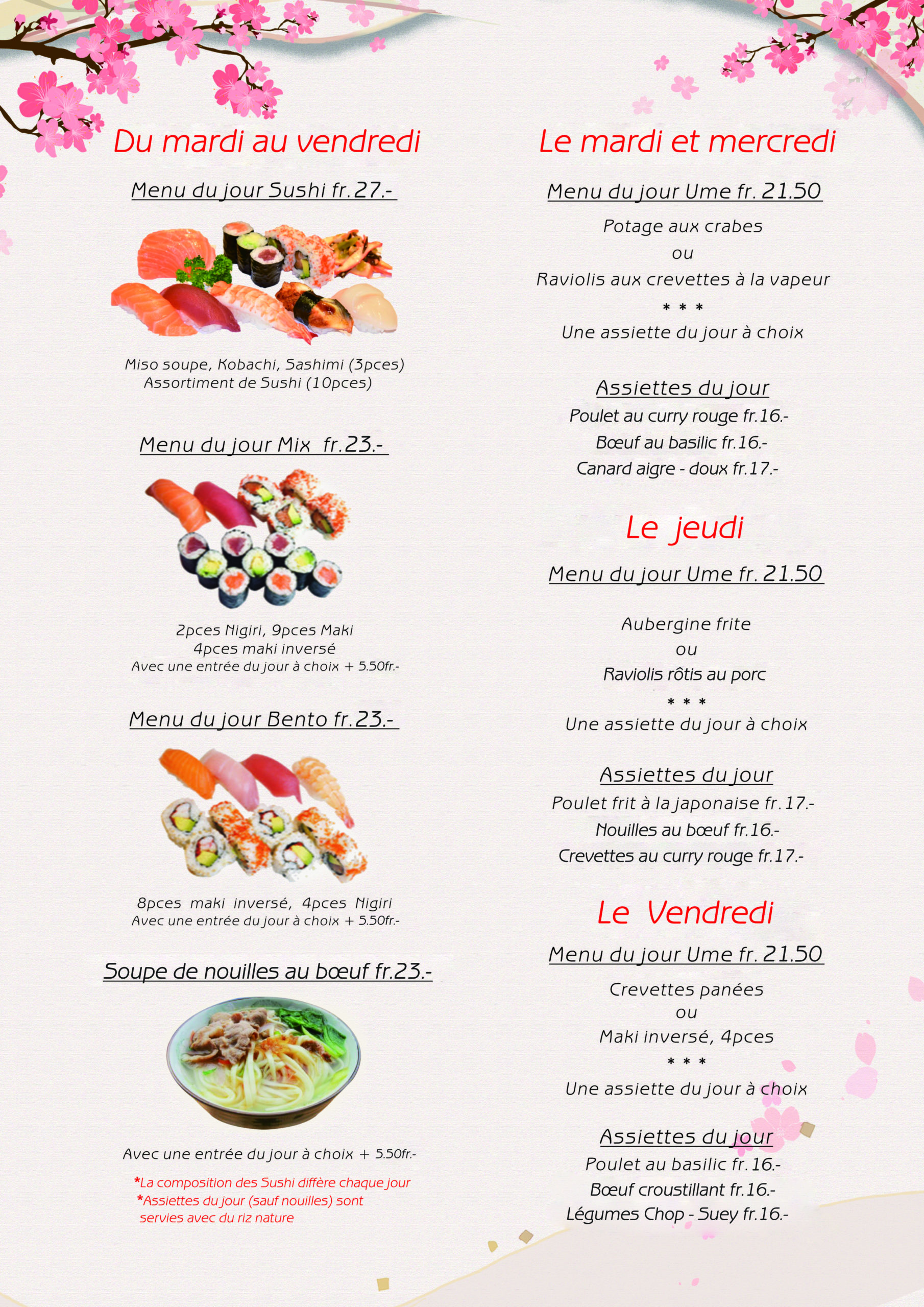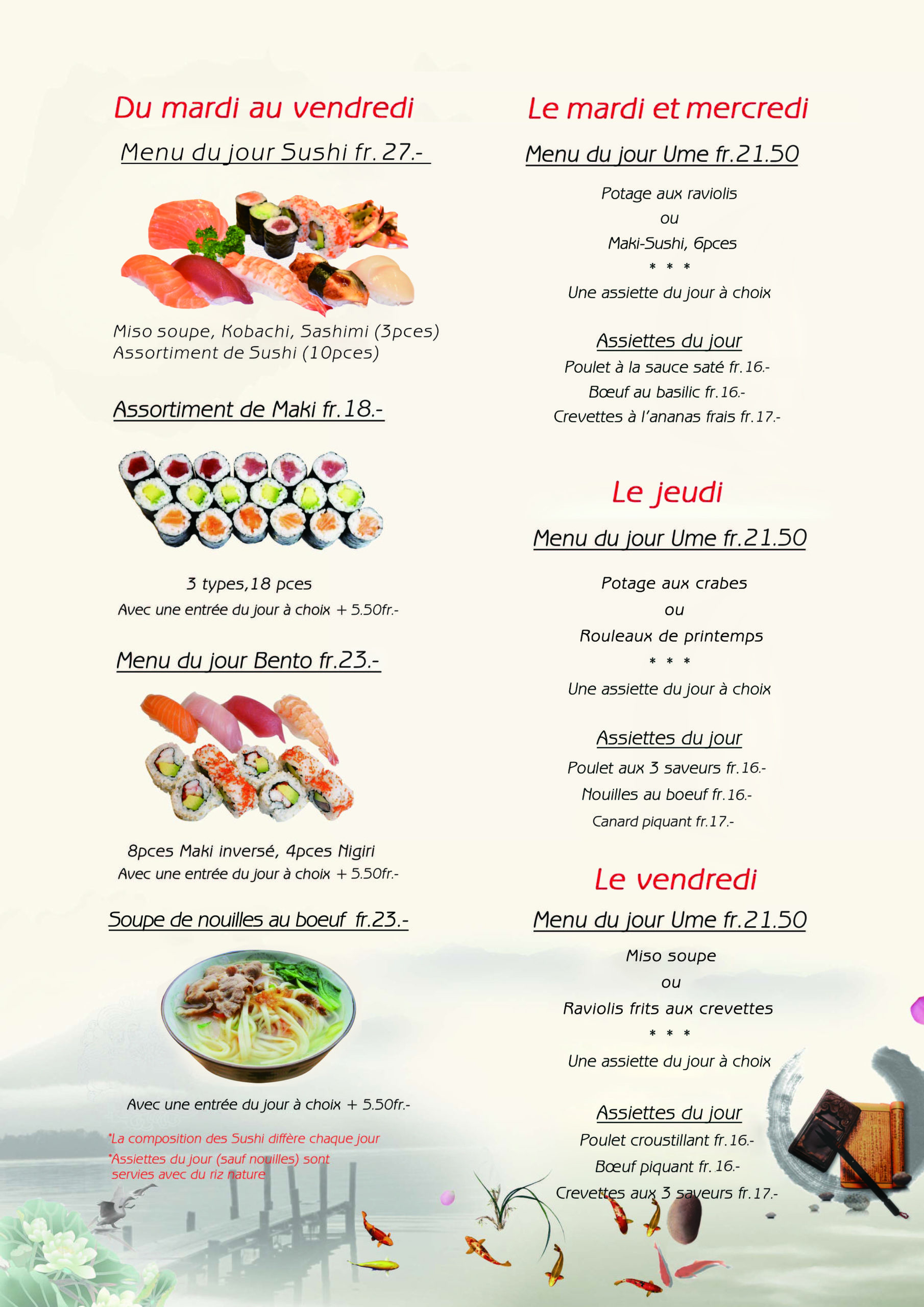 La composition des plats de sushis diffère chaque jour et est choisi par le chef.